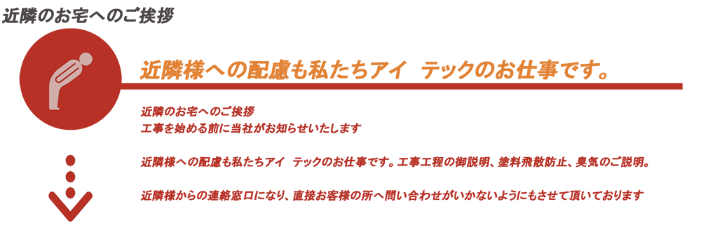 近隣様への配慮も私たちアイ テックのお仕事です。工事工程の御説明、塗料飛散防止、臭気のご説明。